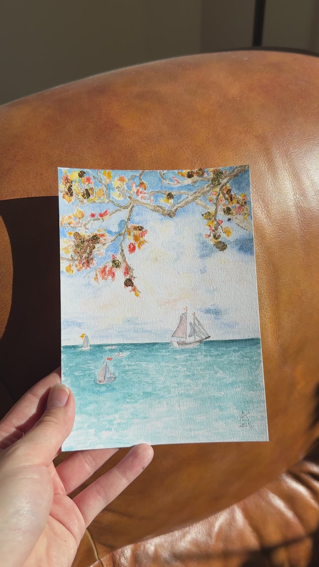 • 5 x 7" watercolor painting and metallic leaf with gold frame